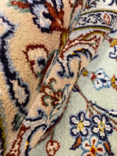 An early 20th century signed Central Persian Kashan floor carpet runner rug. The rug having a central light blue medallion with repeating intricately detailed floral & foliate decorations. Central panel enclosed within a series of outer borders on cream ground with further details. Signed to one of tassel's side. Tassels to ends. Measures approx. 400cm x 300cm.