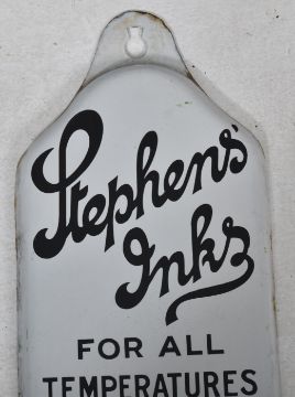 Stephens Inks - a vintage mid century circa 1960s enamel oversized wall hanging thermometer (lacking mercury glass measure tube). The thermometer holder on white ground with black lettering For All Temperatures. Light edgewear & rusting to extremities. With instructions printed to verso, H. C. Stephens. Measures approx. 93cm x 18cm.