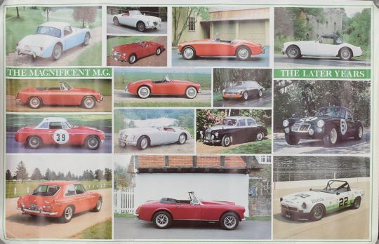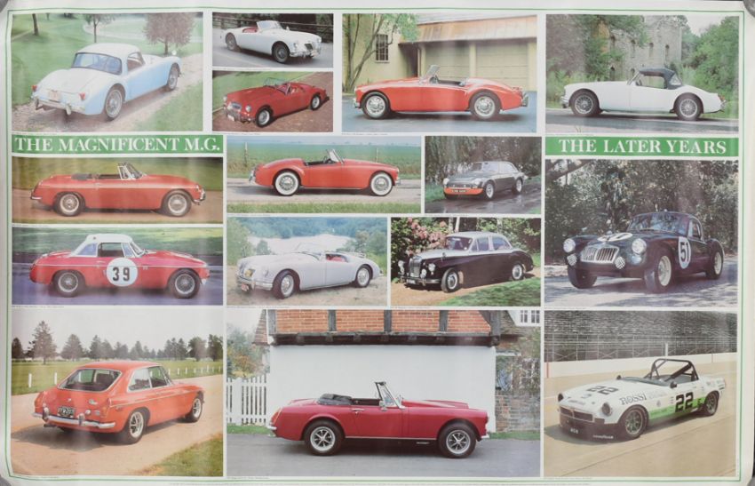 Motor Racing - two vintage Triumph Stag multi photocolour posters together with x2 1980s (1982) ' Magnificent MG with images of MG cars through the 1950s - 1970s. Each measuring approx. 60cm x 95cm.