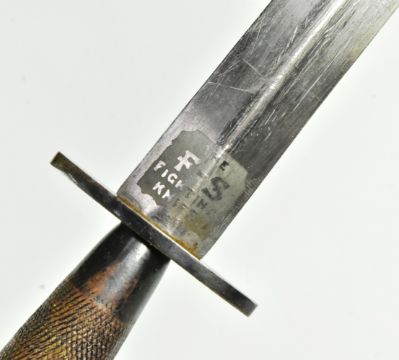 A WWII Second World War British FS Fairbairn Sykes 2nd Pattern commando fighting knife dagger. Typical form with a chequered grip and oval crossguard. The blade stamped for Wilkinson makers, London. Housed in a brown leather scabbard. Measures approx 29cm. If this lot is required to be posted please see sale notes regarding age verification.