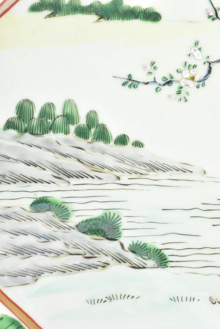 A pair of Japanese Meiji period (1868-1912) octagonal enamelled chargers. Each charger decorated with two maidens by willow tree, prunus tree, rocky landscapes in the centre, peonies, chrysanthemums, cherry blossoms and leaves along the everted rim. Blue leaves and blue embroidered ball with ribbons to exterior, three blue ring to the rim. Measures approx. 33cm diameter.