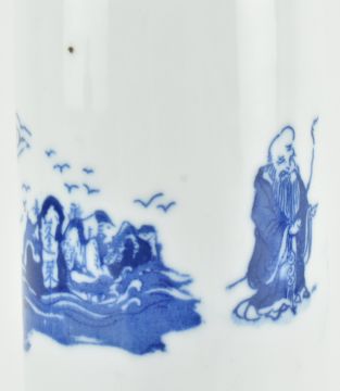 A Republic period blue and white incense sticker holder. The holder decorated with a scene of eight immortals crossing the sea. Six character marked to the base. Measures approx. 13.8cm tall x 3.8cm diameter.
