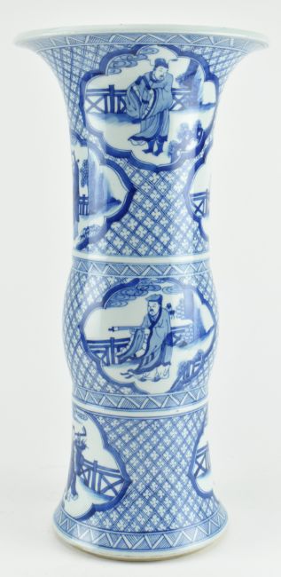A blue and white "Eight Immortals" beaker vase. The "Gu" shaped vase decorated in bright blue tones with ogival-shaped panels, each enclosing one of the Eight Immortals, four on the neck, two on the convex mid-section, and two on the lower body, all panels on geometric ground between various decorative borders. Double blue rings to the base. Measures approx. 46cm tall.