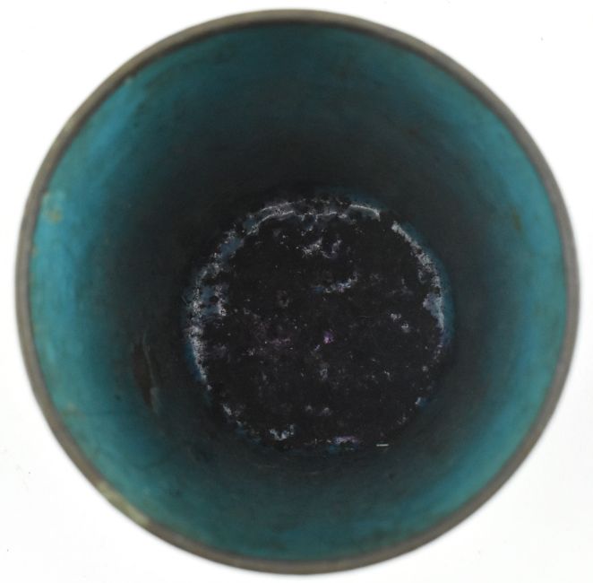 A group of four Qing dynasty/Republic period cloisonne pieces. The lot comprising one Qing dynasty tumbler decorated with flowers and ruyi clouds, one tea cup decorated with two four-claw dragon chasing flaming pearl, a miniature jar decorated with, two four-claw dragon chasing flaming pearl and one early Republic period floral miniature vase. Largest measures 11cm tall.