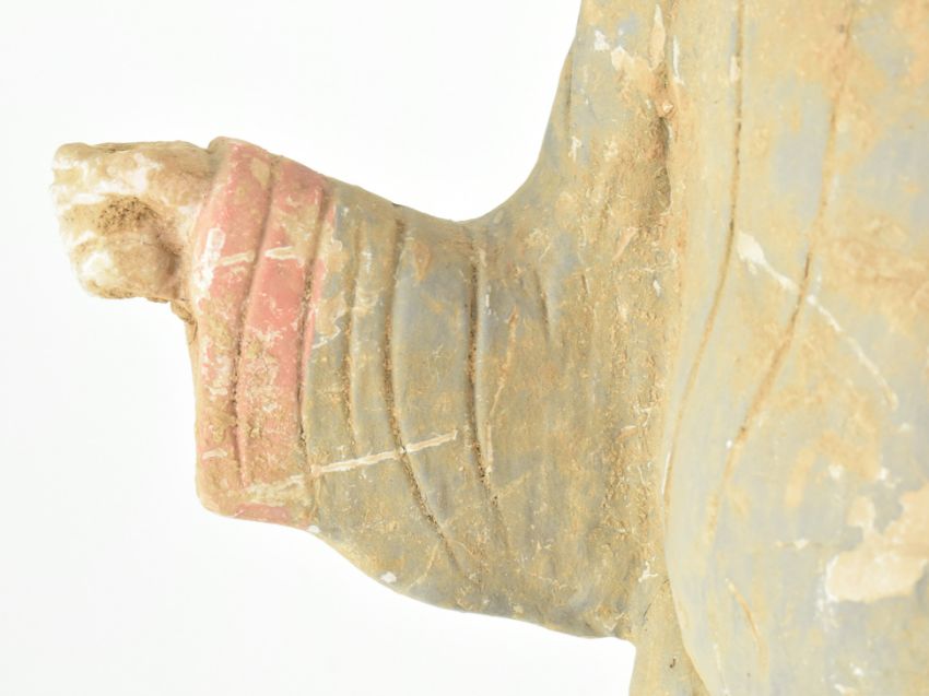A Chinese Tang Dynasty (202 BC – 220 AD) terracotta figurine of unusual form modelled with one hand raises up, holding something in this hand, wearing a long robe and a "Putou" headwear . Remains of feint painted decoration present. Measures approx. 48 cm tall.