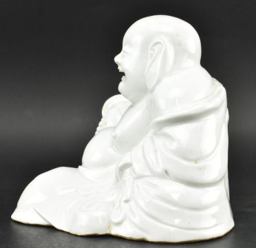 A Qing dynasty Dehua blanc de Chine figurine of Budai/ Laughing buddha. The seated Budai modelled as him seated with one hand resting on his knee and the other holding a rosary, wearing a voluminous robe. Measures approx.  14cm high.