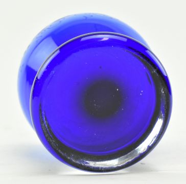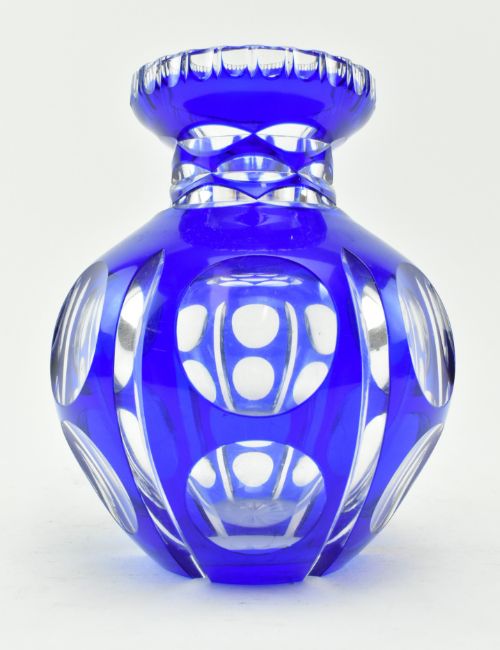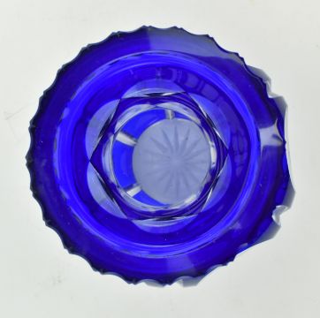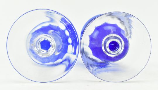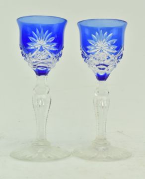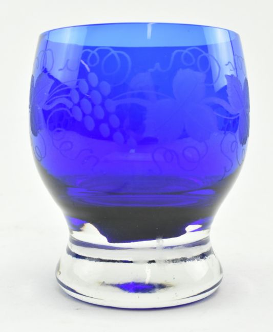 A collection of six late 19th - early 20th century mostly Bohemian flash cut glass in cobalt. The lot comprising a bulbous vase with round facet cut design & star cut base, a similar goblet with hexagonal cut stem, a wine glass with strawberry cut glass collar and fluted bowl, single disc knop in stem, a Victorian Bristol Blue style engraved tumbler featuring grape and wine design, and a pair of cut sherry glasses with dog tooth stems. Tallest measures approx. 19cm tall.