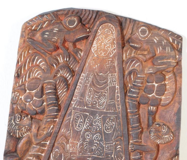 Hand carved wooden Storyboard, understood to be carved by the Kambot people along the Keram River area of Papua New Guinea. The story is told within the outline of a Haus Tambaran. Depicting Oceanian tribal figures with lizards / iguanas to top.  Measures approx. 88cm tall, 47cm wide.