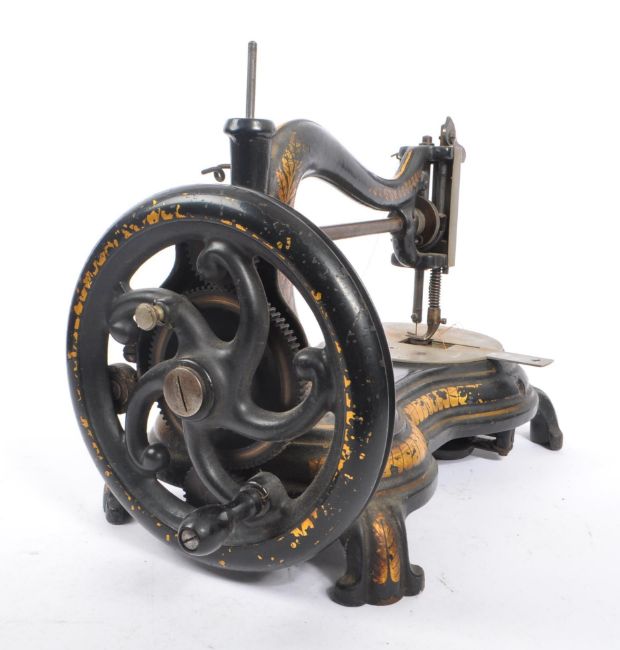 Jones - A 19th century swan neck sewing machine by Jones & Co. The machine having ebonised body with gilt laurel decoration. In original wooden carry case. Measures 34cm length.