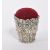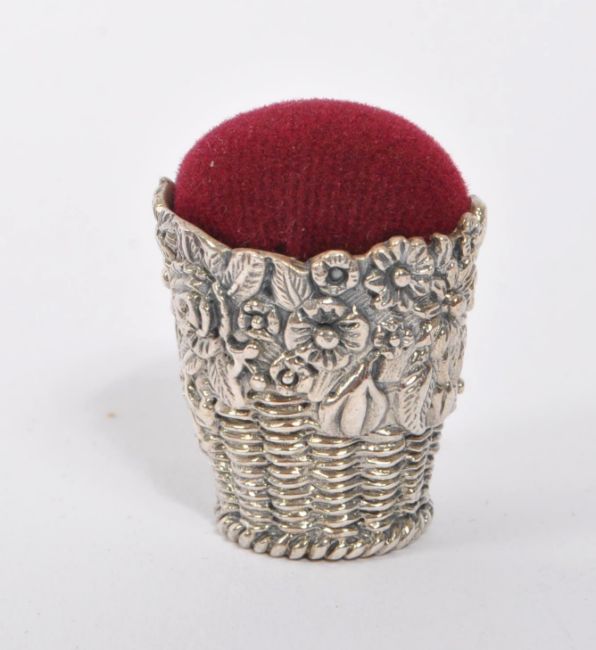 A 20th Century vintage .925 sterling silver pin cushion in the form of a floral basket having dark red cushion material. Measuring approximately 3.5cm x 2.3cm.