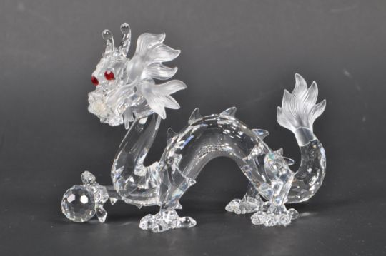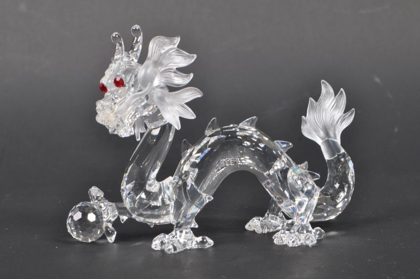 Swarovski - A crystal glass Swarovski ' Fabulous Creatures ' figurine / ornament in the form of a Chinese dragon 208398 having snake like body upon four legs, and red eyes to face. With original box. Measuring approximately 9cm x 13cm.