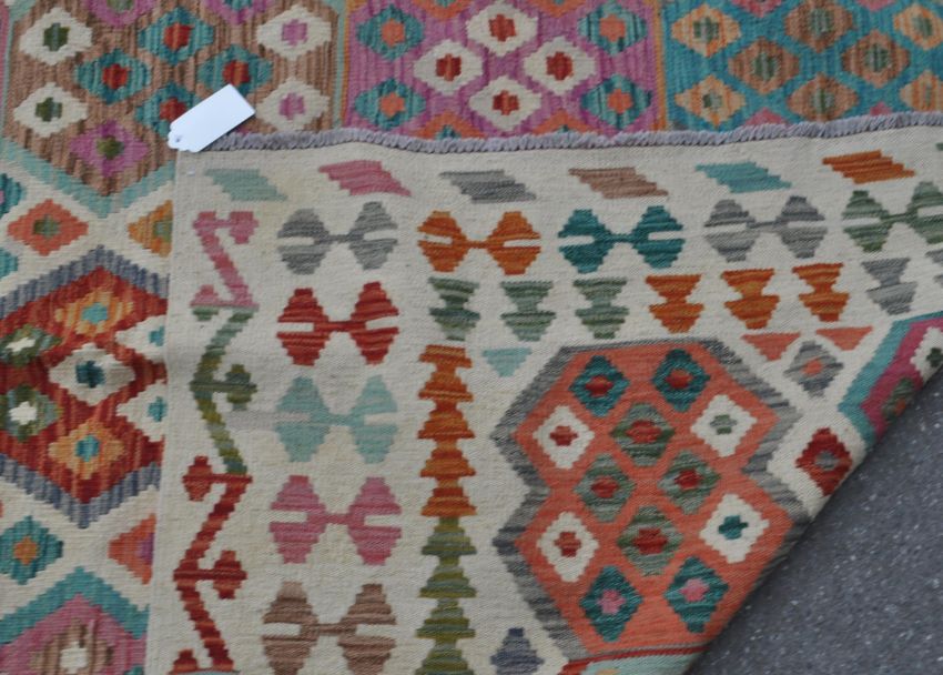 A 20th century Anatolian Turkish Kilim carpet floor rug. The rug having cream ground with polychrome decoration. Featuring diamond shaped patterning to central field, encompassed by canavar ayagi style motifs to border. Tasseled fringes to ends. Measures approx. 240cm x 180cm.