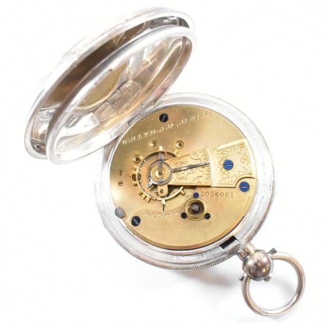 A Victorian hallmarked silver pocket watch with a white tone metal chain. The Victorian silver pocket watch having Roman numeral indices, yellow tone metal hands, subsidiary dial to silver case with vacant cartouche. Hallmarked for Birmingham, 1886. Maker's mark A.B. The lot to come with winding key. Pocket watch measures 7cm x 5cm. Albert chain measures 30.5cm. Total weight 125.9g. All weights, measurements and sizes are approximate.