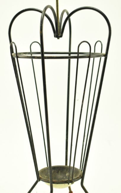 A retro 20th century wire worked stick stand in the form of an umbrella. The stand having a small bamboo handle with red wire wrap. Wire worked sides with all being raised on angular red plastic supports. Measures approx. 85cm x 28cm diameter.