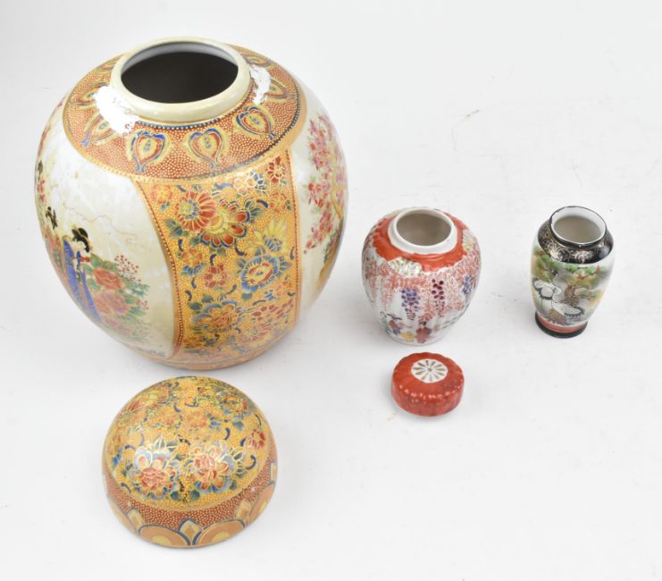 A group of three Japanese Meiji period ceramic pieces. The lot comprising a large Satsuma brocade pattern ginger jar with cover, decorated with geishas in a garden. A miniature vase decorated with herons and pine tree and cherry blossoms, along with a Kutani lobed jar with lid, decorated with geishas. Largest measures approx. 25cm tall x 19cm diameter.