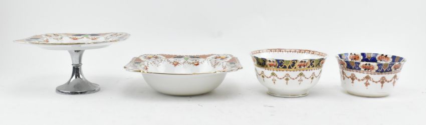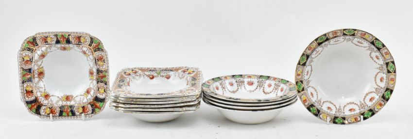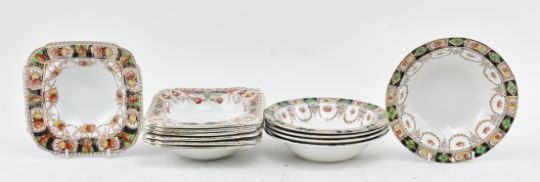 Burgess Bros Longton / Royal Staffordshire / St Michael - a collection of various vintage china tea services by various makers. The lot to include Burgess Bros Longton seven square fruit bowls, a large square fruit bowl, a cake stand, a square plate, a sugar jar and five Carlisle pattern plate, together with two Royal Stafford bowls, five saucers, eight plates and five fruit bowls. Further a St Michael's "heirloom" pattern milk jug, six square plates and a 24cm diameter plate and a shaker pot. Largest measures 11cm tall x 21m diameter.