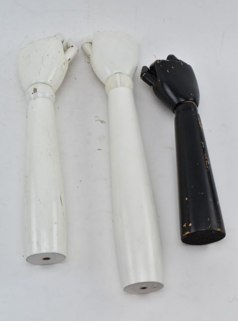 An assortment of vintage 20th century & later painted & carved wood articulated fingers mannequin / shop display hands. The lot to include a pair of white painted hands with forearm, a smaller black painted hand, two wooden colour articulated hands, together with a larger articulated hand & arm. Largest measures approx. 85cm long.