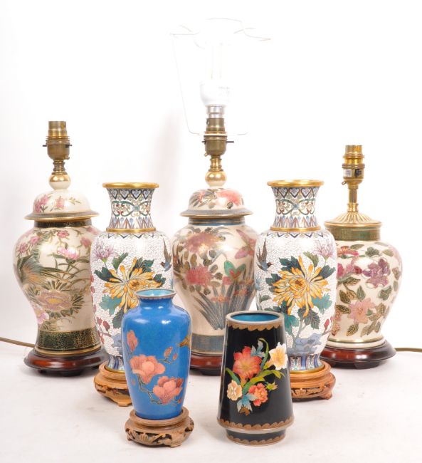 A collection of late 20th century cloisonné vases and Asian ceramic lamps. All with hand painted floral design, metal work to smaller vases with hardwood bases. Geometric repeating pattern with white / blue ground. Tallest measures approx. 34cm