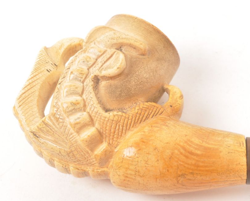 Emanuel Czapek - A 20th Century vintage Czechoslovakian silver collared and carved Meerschaum smoking pipe depicting bust of Edwardian woman to bowl, held within case. (Pipe AF). Together with another smoking pipe having carved claw. Measuring approx. 18cm long.