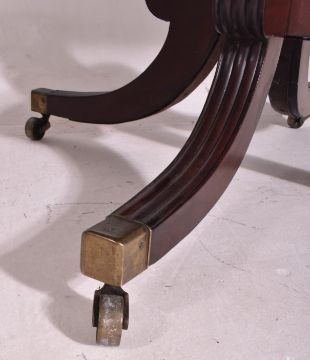 A Regency early 19th century mahogany tilt top pedestal dining / breakfast / loo table. The table having a squared top with brass inlaid details, raised on a central thick turned column with splayed saber legs. All raised on brass castors. Measuring approx. 71cm x 146cm x 103cm.