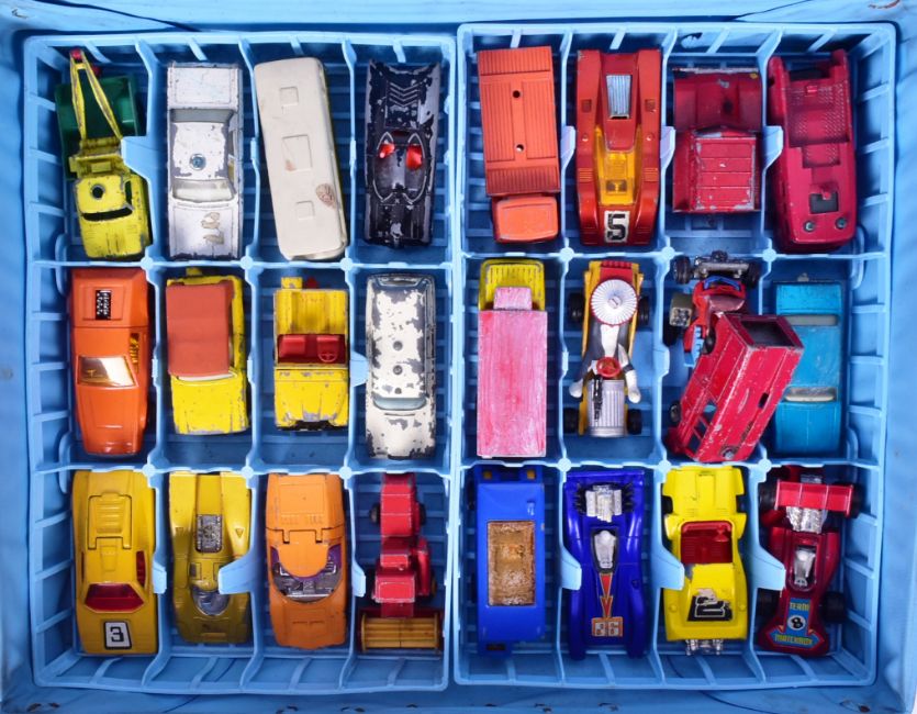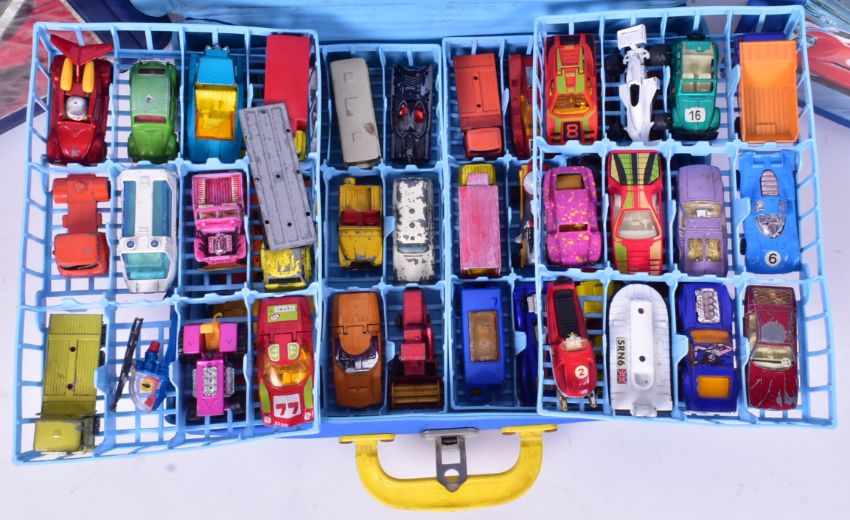 Diecast - Three vintage Lesney Matchbox vinyl carry cases, two of which include a collection of Matchbox and Corgi series diecast model cars. Examples to include: Series No. 30 Beach Buggy, No. 40 Mustang Piston Popper, Ferrari 512 S and many others.