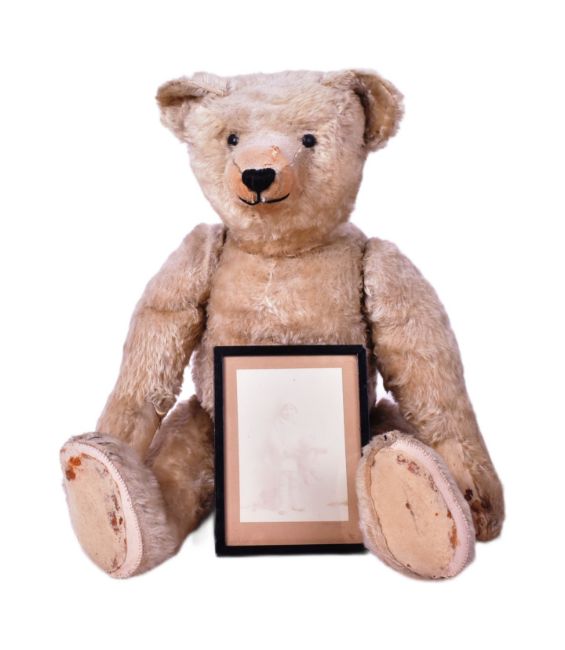 Teddy Bear - a large early 20th century German (likely Steiff ) made teddy bear. Pale golden mohair, with boot button eyes, pronounced snout and a vertically stitched nose, black stitched claws, jointed limbs and head. Felt pads, wood-wool stuffing, and prominent hump with elongated arms. No maker's marks or ear button present. Measures approx 28" / 71cm tall. Supplied with an old photograph of a child holding a teddy bear, believed to be this bear, with a German photographer's credit in pencil to the corner. Faded. Provenance: Believed ex-Bonhams c1990s with old catalogue listing and illustration to rear of photograph frame.  Condition - small tear to the snout, old repairs to the felt pads on feet and some repairs / wear to the felt pads on the hands, small areas of baldness etc. Other repairs / wear may be present. Generally in very good condition for age.