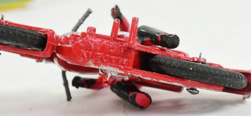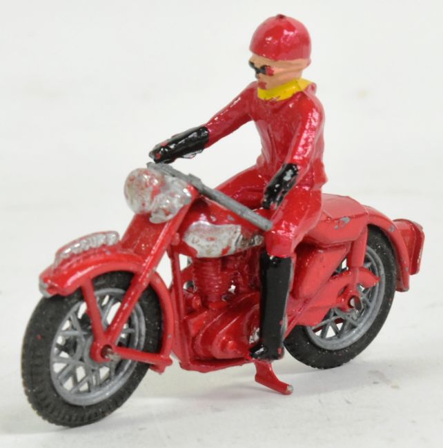 Diecast - a vintage 1950s Benbros made diecast model motorcycle rally rider with detachable driver and rubber tyred wheels.