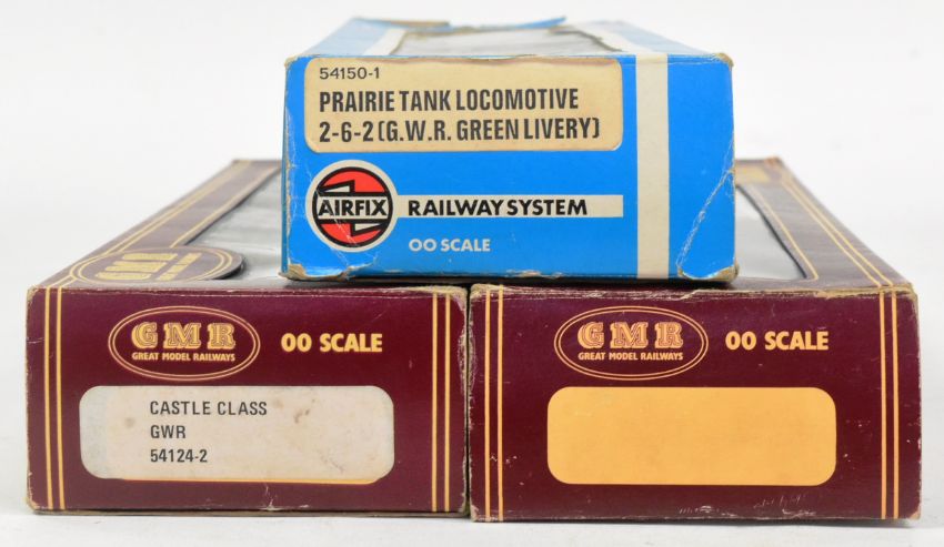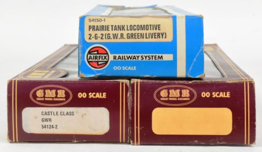 Model Railway - x3 original Airfix / Great Model Railway OO gauge trainset locomotive engines comprising; x2 Castle Class 4-6-0 4073 'Caerphilly Castle' and Class 61xx 'Large Prairie' 2-6-2T 6110 in GWR green.