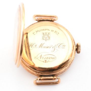 A Henry Moser & Cie - Swiss 14k gold wristwatch. The watch with enamel Arabic dial signed Hy. Moser & Cie having Arabic numbers in black, red at the 12 position. The case stamped to both rear and inner door 56 14K along with the Swiss Squirrel punch mark and issue no.184948. Also, written in Russian script for Henry Moser & Co on the inner case in reference to when Henry Moser was originally based in St Petersburg. Total weight 16.90g. Lacking strap, hands loose behind glass. All weights, measurements and sizes are approximate. All watches are sold as untested, therefore without warranty.