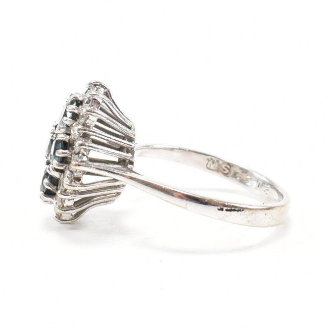 A hallmarked 18ct gold sapphire and diamond cluster ring. The ring set with four round mixed cut sapphires framed by round brilliant cut diamonds to tapered shoulders. Hallmarked for London, 1979. Sponsor's mark MS. Weighs 5.1g. Size M. All weights, measurements and sizes are approximate.