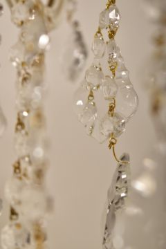 A 20th century Italian Venetian Murano glass chandelier / electrolier. The ceiling light having central twisted glass stem with eight curved glass branches each with glass flowerhead roundels and a central brassed support. Measures approx. 50cm x 67cm diameter.