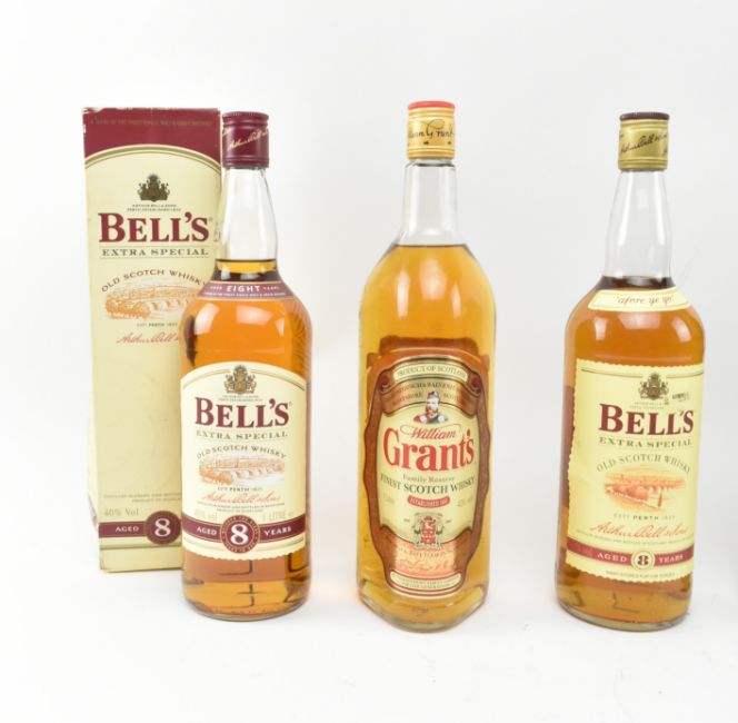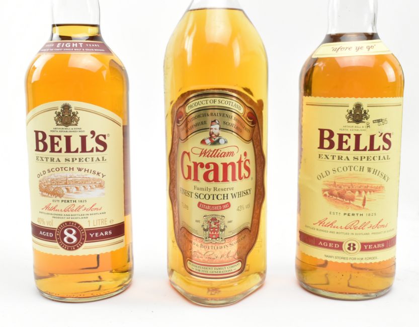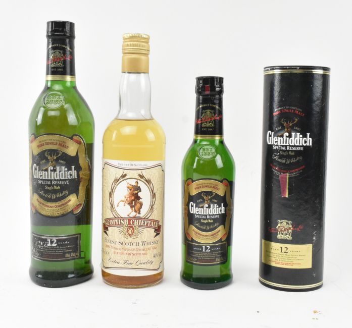 An assortment of six vintage & later Scotch Whisky bottles. The lot to include a 12 years old Glenfiddich Special Reserve single malt Scotch Whisky, 70cl, 40% vol, seal intact, a boxed 12 years old Glenfiddich Special Reserve single malt Scotch Whisky, 35cl, 40% vol, seal intact, a William Grant's Family Reserve Finest Scotch Whisky. 1 litre, 43% vol., cap intact, two 8 years old Bell's extra Special Old Scotch whisky bottles, one boxed, 43% vol, 1 litre, together with a Scottish Chieftain finest scotch whisky, 70cl, 40% vol capt intact.