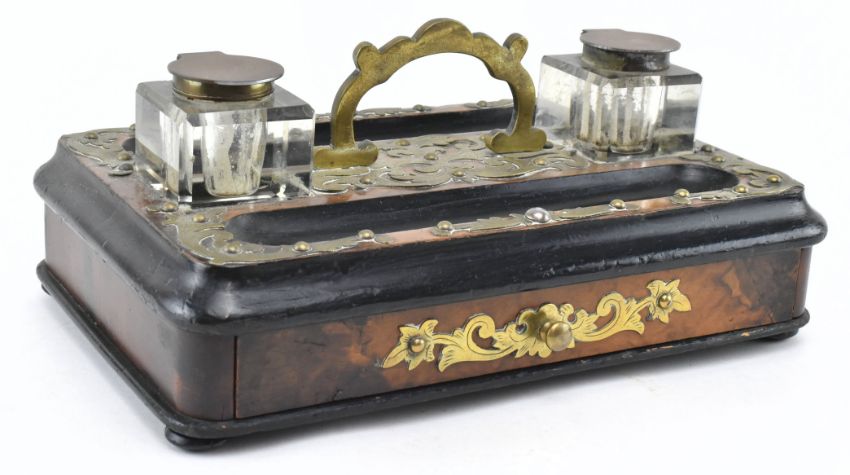 A 19th century Victorian ebonised wood and burr walnut brass inlaid desk tidy. The desk tidy with foliate scrolled and Gothic style studded brass inlay and handle, twin bevelled glass inkwells inset to the tidy, and twin ebonised pen rests. This over a single drawer to the front. Raised on four bun feet. Measures approx. 15cm x 30cm x 20cm.