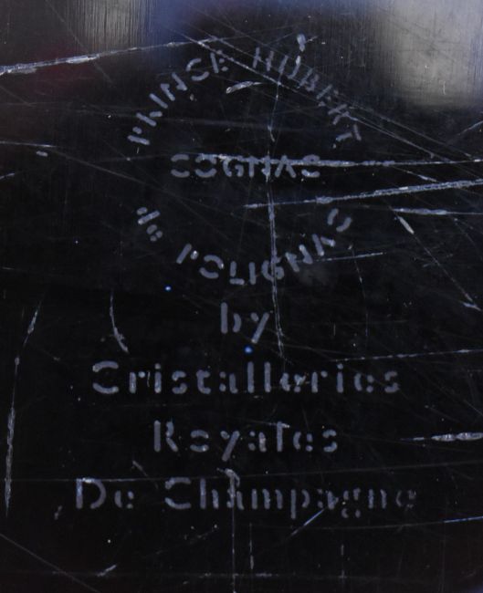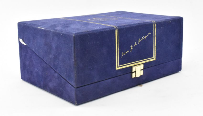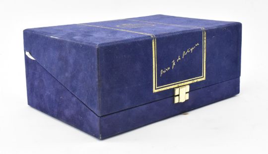 A vintage circa 1990s Prince Hubert de Polignac Cognac fine champagne in Crystal Sevres blue crystal bottle. From the Collection de Cristal. Plastic seal and cork intact. All in original blue velvet case.
