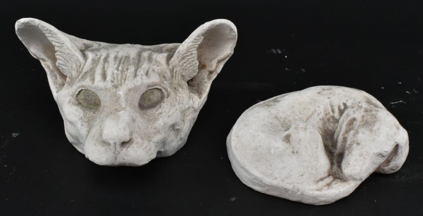 A collection of eight mid century architectural reclamation figural plaster wall corbels & decorative items. The lot to include a pair of bunches of grapes, a ram's head, a curled up dog, three column corbels with foliate or beaded design, and one oversized part curved piece with incised design. Largest measures approx. 33cm x 20cm.