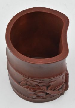 A 20th century Chinese zisha brush pot. The clay pottery brush holder in the form of bamboo featuring relief prunus and pine trees. Measures approx. 11.5cm tall.