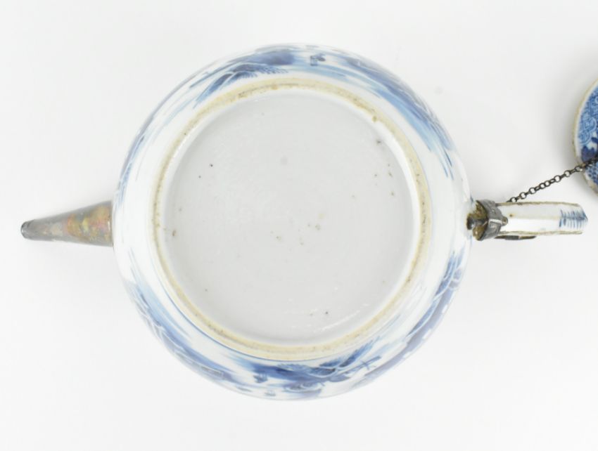 A Qing dynasty Kangxi period blue and white teapot. The ovoid form tea pot with metal spout decorated with landscapes, houses, pagodas, bridge and figurines, with a cover with peach finial. The handle has been restored and chip the rim.  Measures approx. 14cm tall x 25cm long.