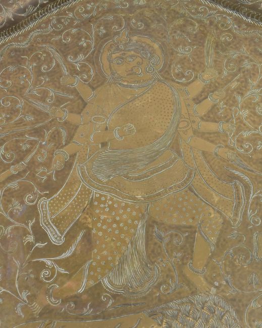 A large Anglo Indian engraved brass tray. The scallop edge tray decorated with engraved figures, animals and vignette motif throughout. Measures approx. 72cm long.