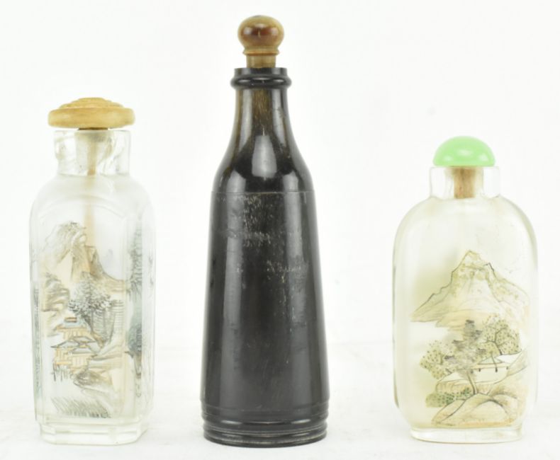 A collection of five late Qing dynasty 19th/20th century snuff bottles. The lot comprising a metal enamelled snuff bottle depicts a scene of figurines with inlay stones stopper, a horn snuff bottle with stopper, a square glass snuff bottle depicts landscapes, fish with algae and birds with stopper, a amber-like glass snuff bottle depicts, further a glass snuff bottle with a man riding a donkey, dated 乙未年 1895 Spring. Square snuff bottle with slight crack to neck. Largest measures approx. 10m tall.