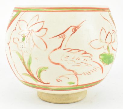 A finely potted jardiniere, the body is raised on a high foot ring and covered with a cream slip painted in red and green lotus and birds, all under a clear glaze that stops on the lower body to reveal the pale grey ware. Measures approx. 16.5cm tall x 19cm diameter.