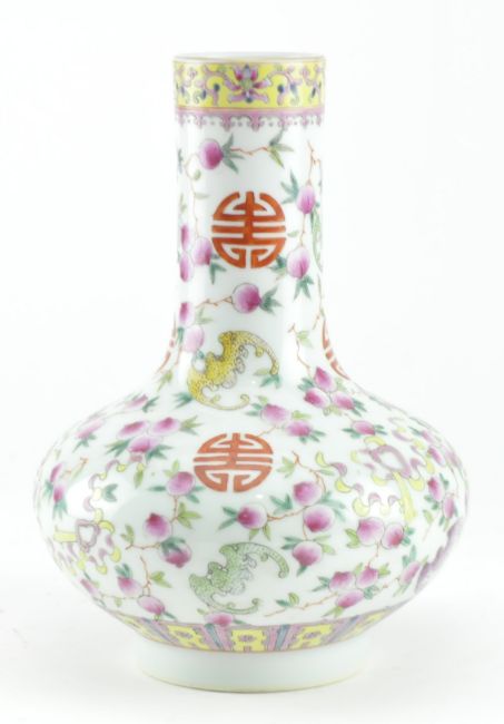 A Republic period (1912-1949) famille rose bottle vase. The bottle vase has a long cylindrical neck, decorated with band of yellow ground with pink foliage scrolling on the neck rim, bats, peaches and "Shou - longevity" in Chinese symbol on the body. Six characters Qianlong mark to the base. Hairline to the body. Measures approx. 23cm tall.