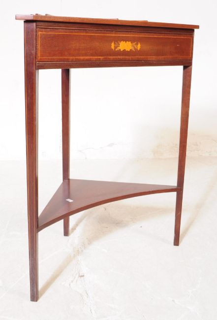 An Edwardian mahogany inlaid corner side table. The table having gallery back with crossbanded top over floral inlaid frieze raised over tapering supports united by under tier. Measures approx. 71x62x34cm