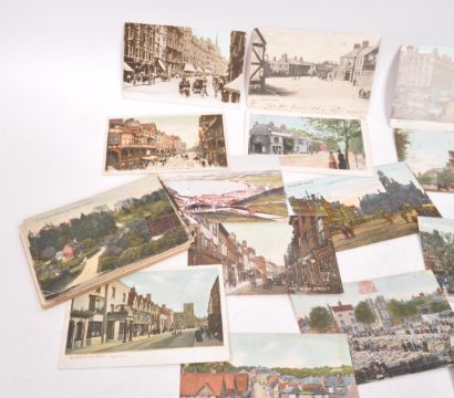 Topographic Postcards. Extensive collection approx. 4,200 in storage box. All postally used with Great Britain postage stamps of Edward 7th and George 5th (1901-1920s). Cities, towns and villages with urban, rural and coastal scenes. Streets / buildings over widespread area. Postal History interest for postmark collectors. Unsorted variety