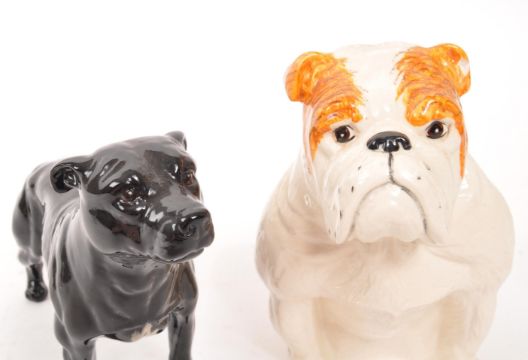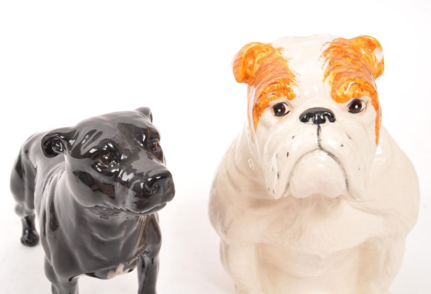 Royal Doulton / Beswick - A collection of three china dog figures, comprising of an English Bulldog and a Staffy both by Royal Doulton. Together with another small bulldog by Beswick. Largest measuring approximately 13cm tall.
