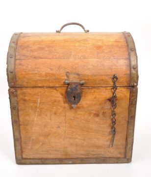 A 19th century oak wood domed top bottle casket box. The casket having a hinged lid to top, with metal coopered banding to edges, and swing handles to sides. The interior being segmented, with spaces for six bottles. Measures approx. 35cm x 32cm x 22cm.