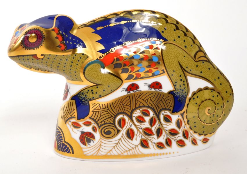 Royal Crown Derby - A porcelain china Royal Crown Derby paperweight figure ' Chameleon ' designed by John Ablitt. With gold stopper intact. Measuring approximately 9cm x 14cm x 5cm.
