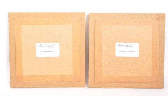 Anita Harris - Two original 1970s retro framed studio art glazed ceramic tiles having bold geometric designs in red and orange colourway in the style of Poole Pottery Delphis. Both signed in gold to bottom corner by artist. Measuring approximately 21cm x 21cm.