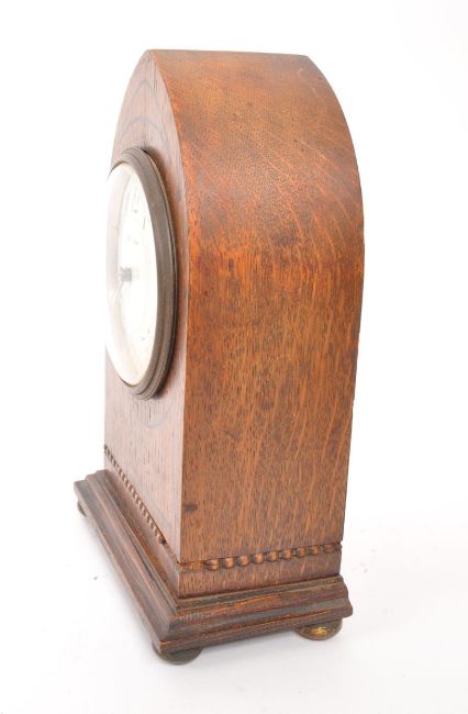 Mappin & Webb - A mid Century circa 1950s oak Mappin & Webb mantel clock having a three pointed arch shape with reeded decoration, raised on circular brass feet. The clock face having Arabic numerals. Measuring approximately 22cm tall.