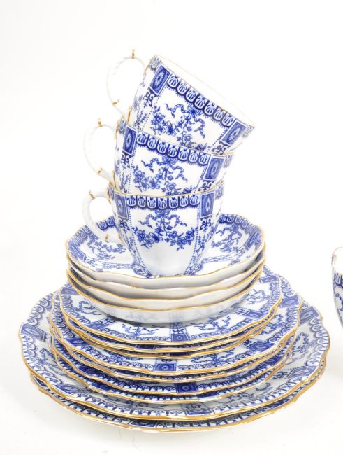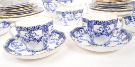 Royal Crown Derby - An early - mid 20th Century porcelain china Royal Crown Derby tea / dinner service having blue and white pattern. Comprising of 12x tea cups, 12x saucers, 6x cake plates, 8x side plates, 4x dinner plates, milk jug and large sugar bowl.
