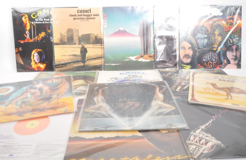 Camel - A collection of 20th century Camel pop rock vinyl LP records. The collection to include examples such as Mirage, I Can See Your House From Here, The Snow Goose, Rain Dances, Nude, Under Age, and Camel, amongst others. To contain fourteen albums in total.